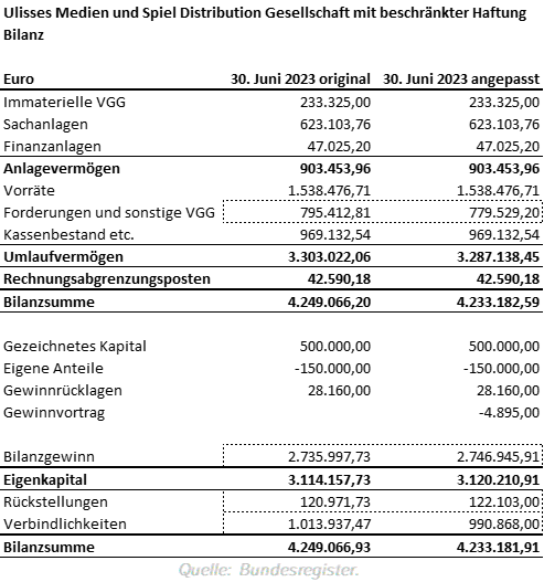 Nach langer Zeit veröffentlichte Ulisses in den letzten Monaten die Jahresabschlüsse für die Geschäftsjahr 2023 und 2024. In beiden Fällen wurden Erleichterungen in Anspruch genommen, so dass de facto verkürzte Abschlüsse publiziert wurden. Formal erfolgte die Veröffentlichung zu spät, da die Frist hierfür zwölf Monate nach Geschäftsjahresende beträgt. Da das Geschäftsjahr Ulisses zum 30. Juni endet, hätte der Abschluss für das Geschäftsjahr 2024 am 30. Juni 2025 veröffentlicht werden müssen – ausweislich dem Unternehmensregister erfolgte die Einreichung aber erst am 11. September 2025.